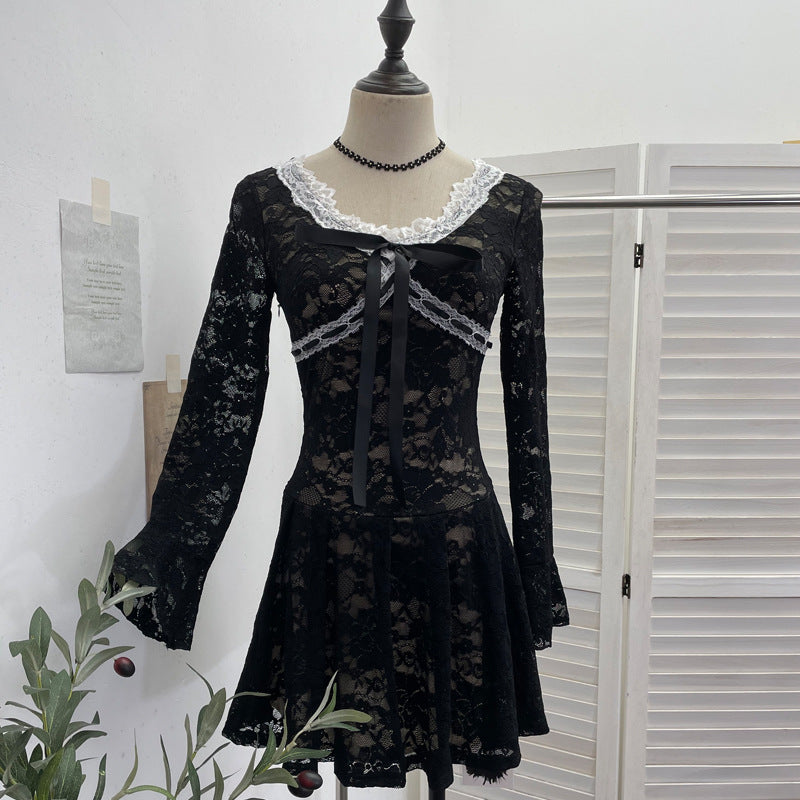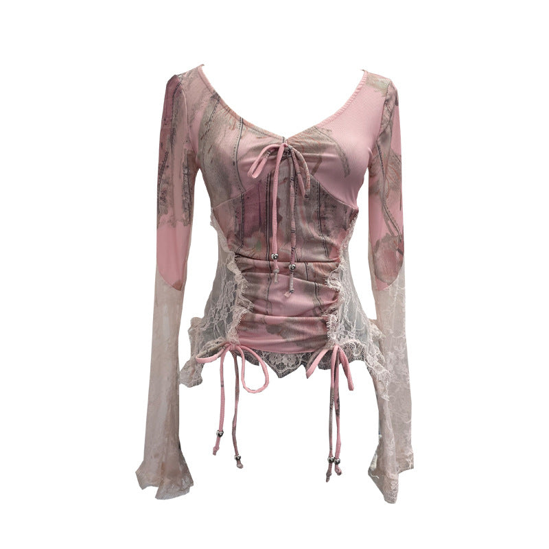 Design Lace Splicing Long-Sleeved T-Shirt Women's Bow Strap Hollow Irregular Blouse 6179 HZ1208