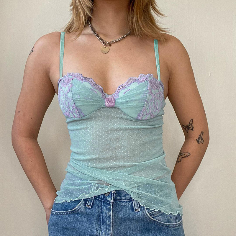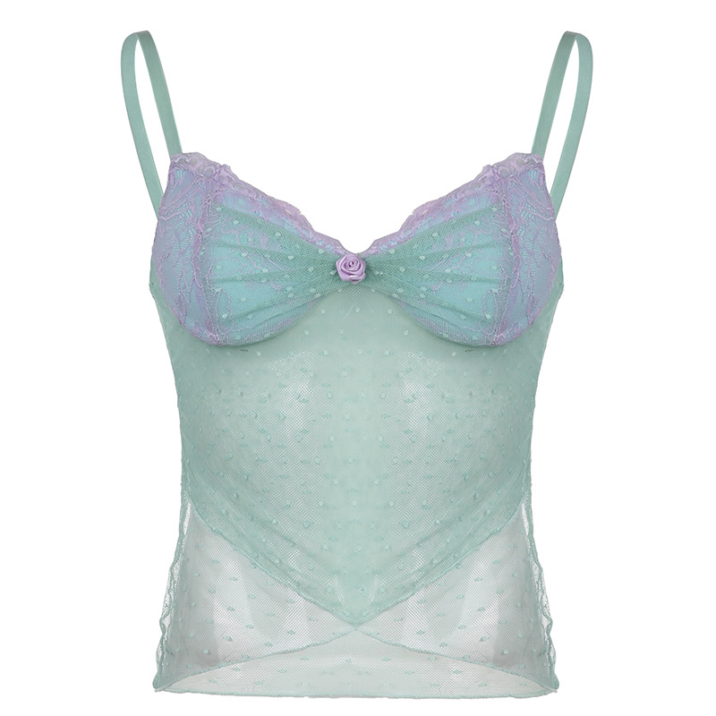 French Girl Irregular Sling Vest 2025 Summer Wish New Wave Point Mesh Splicing Bolling Blouse Woman HZ1220