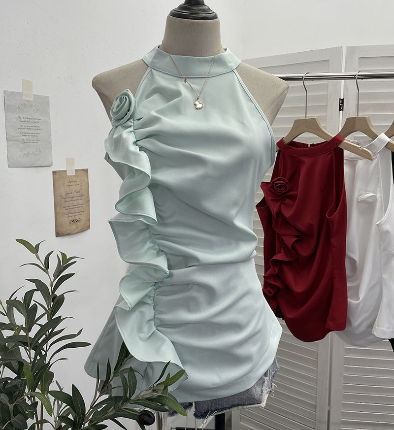Spicy Design Sleeveless Leaves Three-Dimensional Flower Blouse Atmosphere Slimming Waist 1166 HZ1208