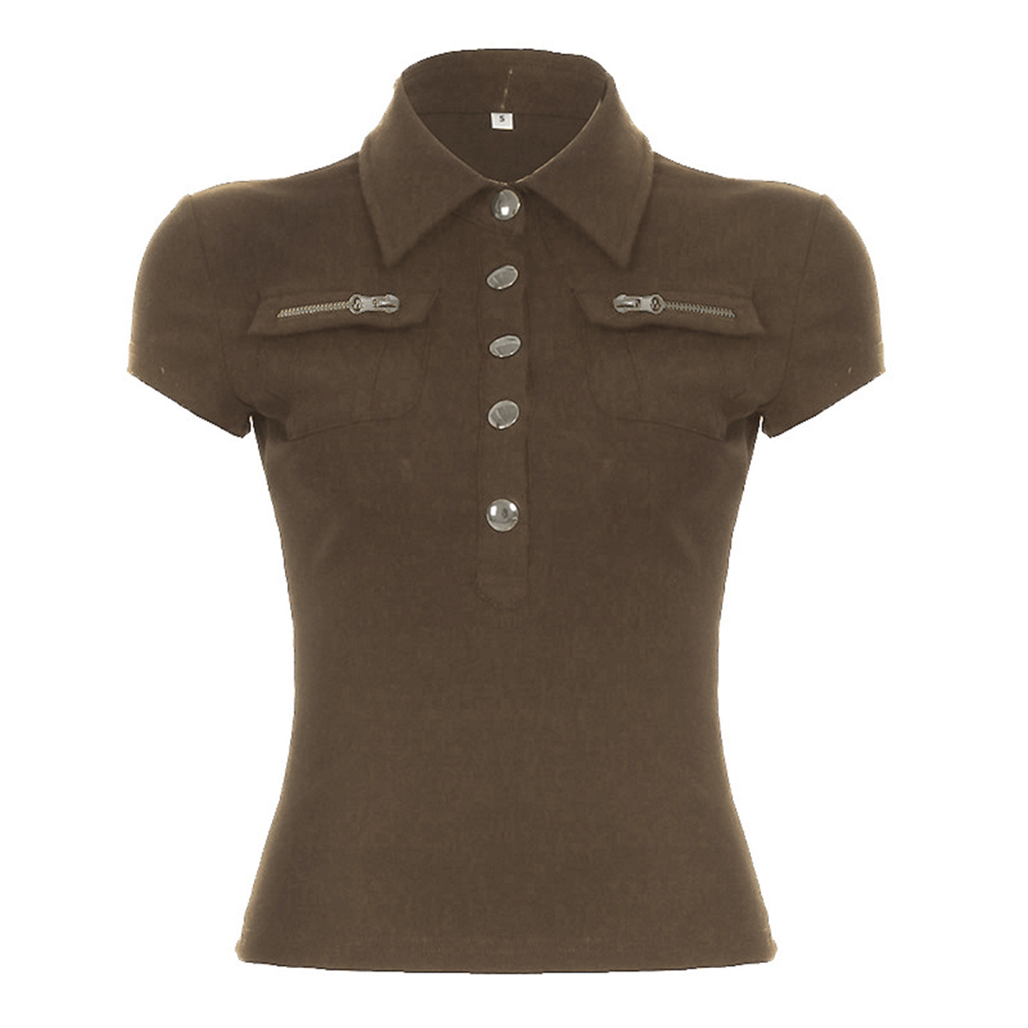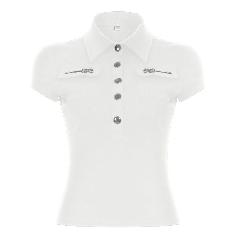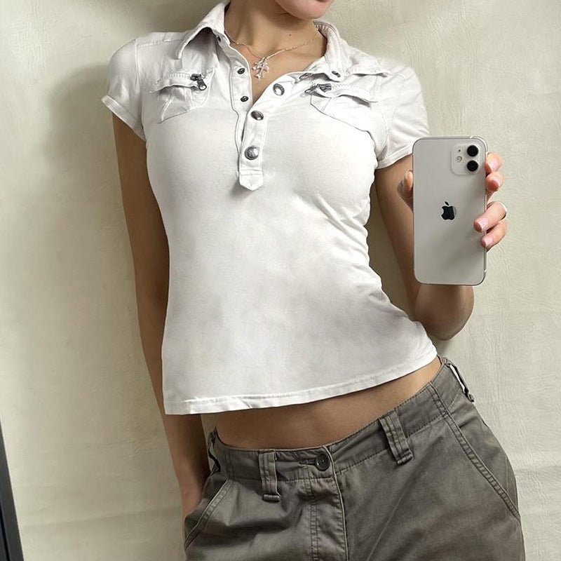 Women's Fashion Street Trend Artificial Style Collar Foundation Solid Color Hottie Short-Sleeved T-Shirt Blouse New HZ1220