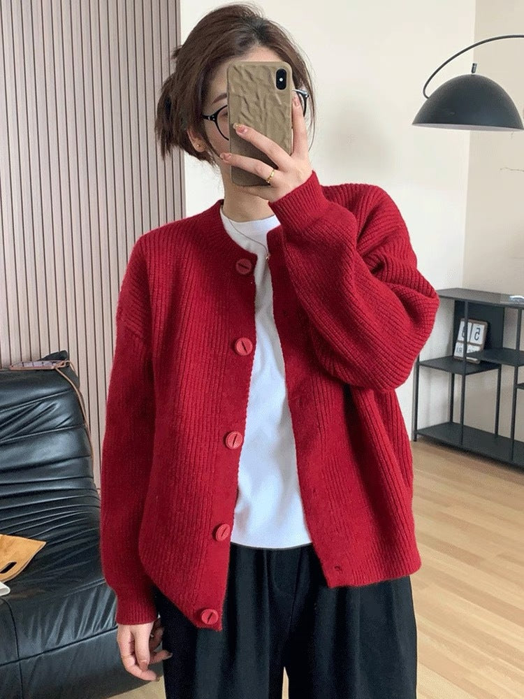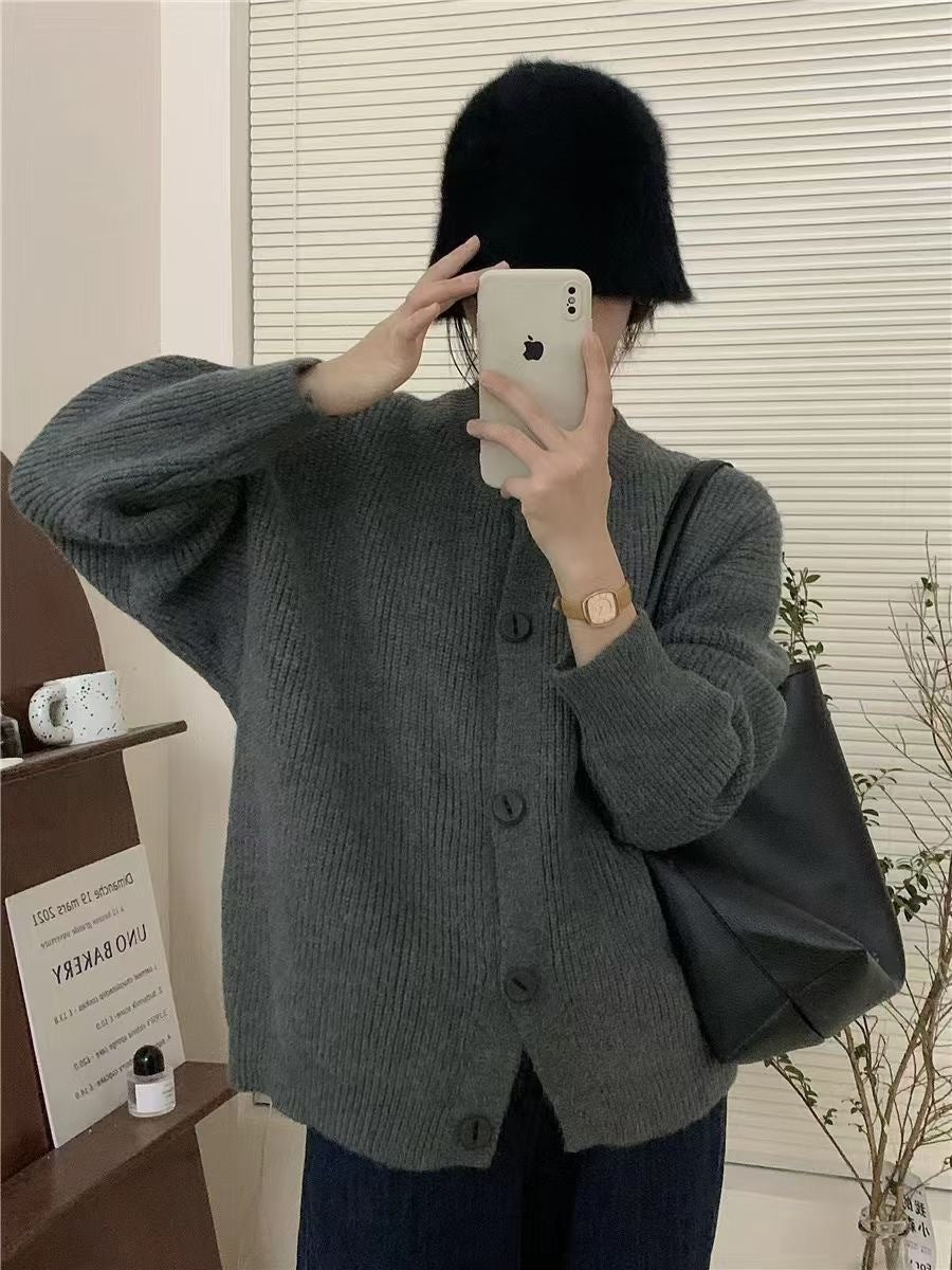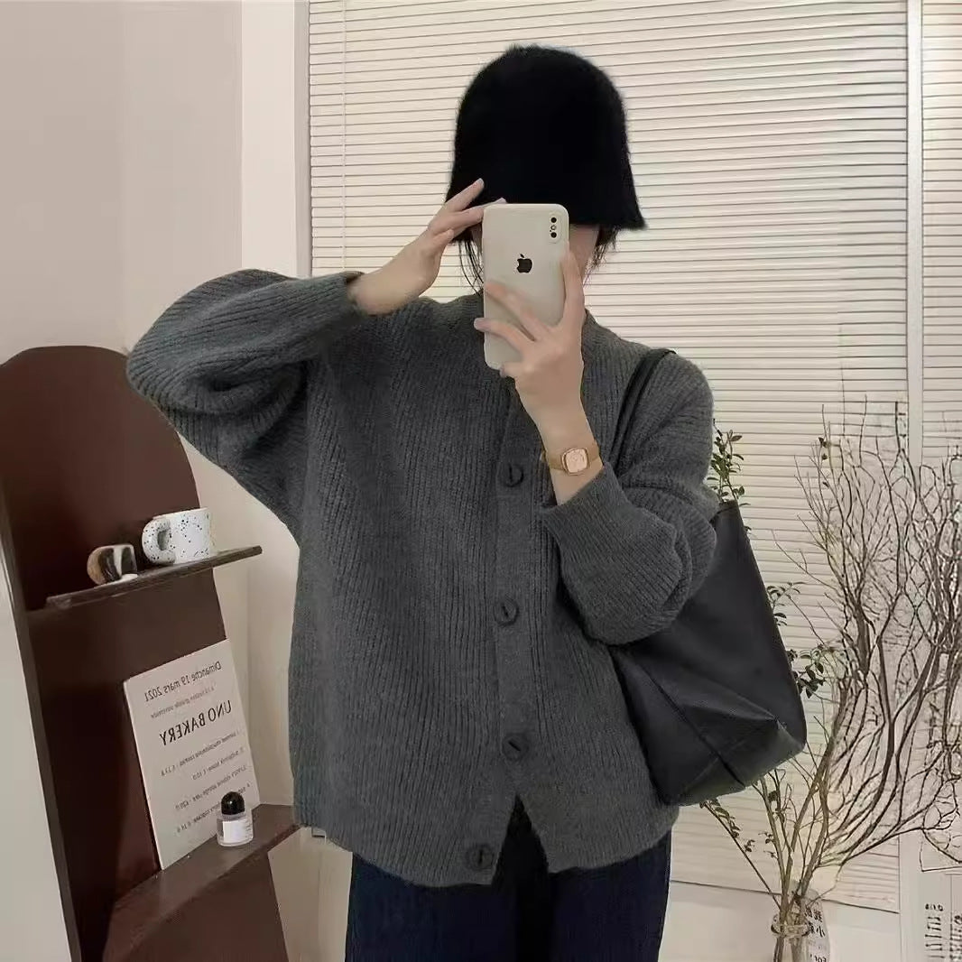 Autumn/Winter 2025 New Lazy Korean Sweater Cardigan Women's Soft Sheeps Pits Button Sweater Dark Grey HZ1208