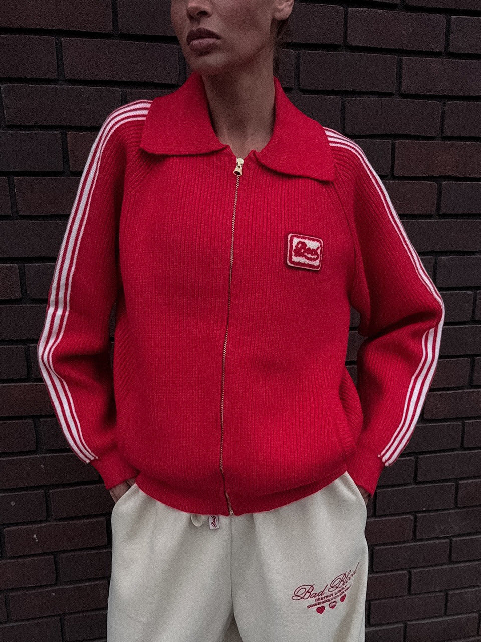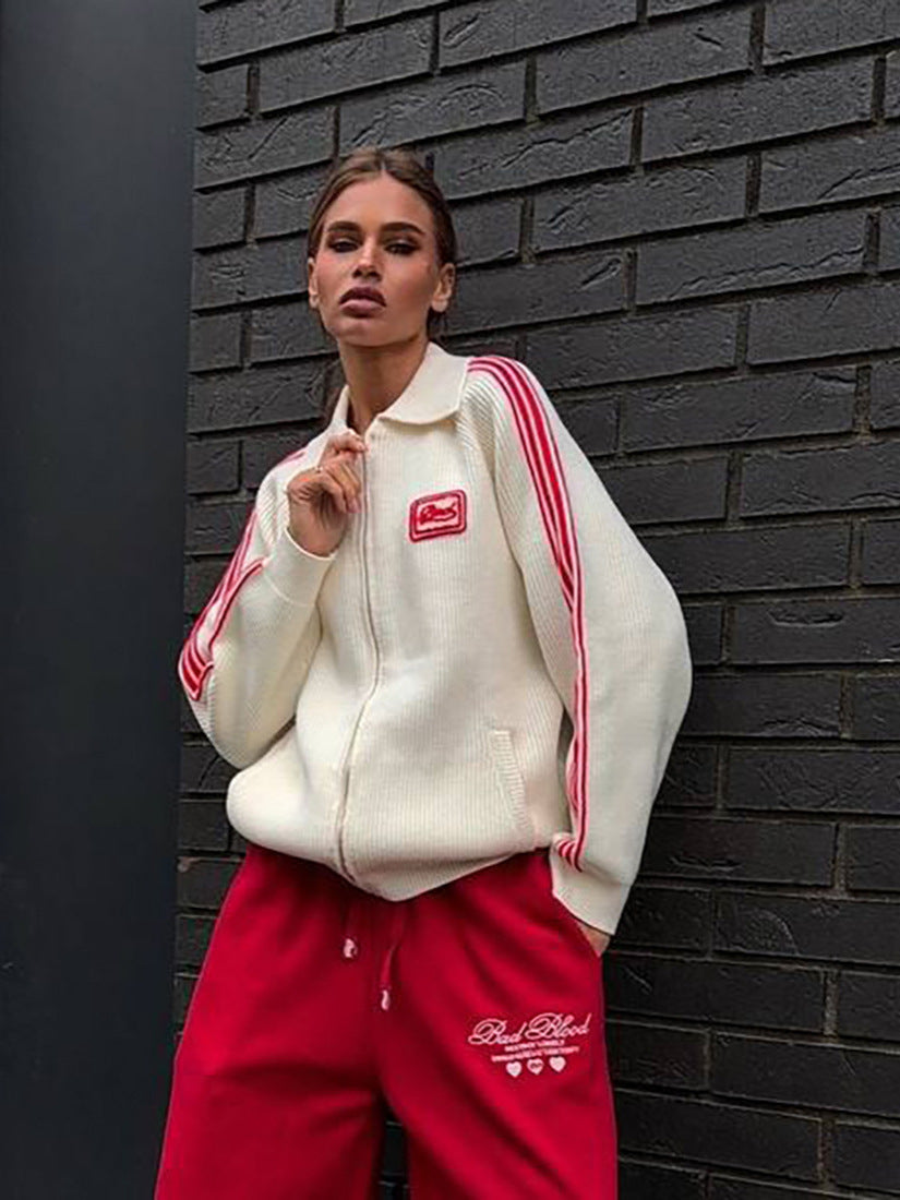 Striped Knitted Cardigan Collar Zipper Retro Sports Rice White Hit Red High Street Burst Autumn HZ1208