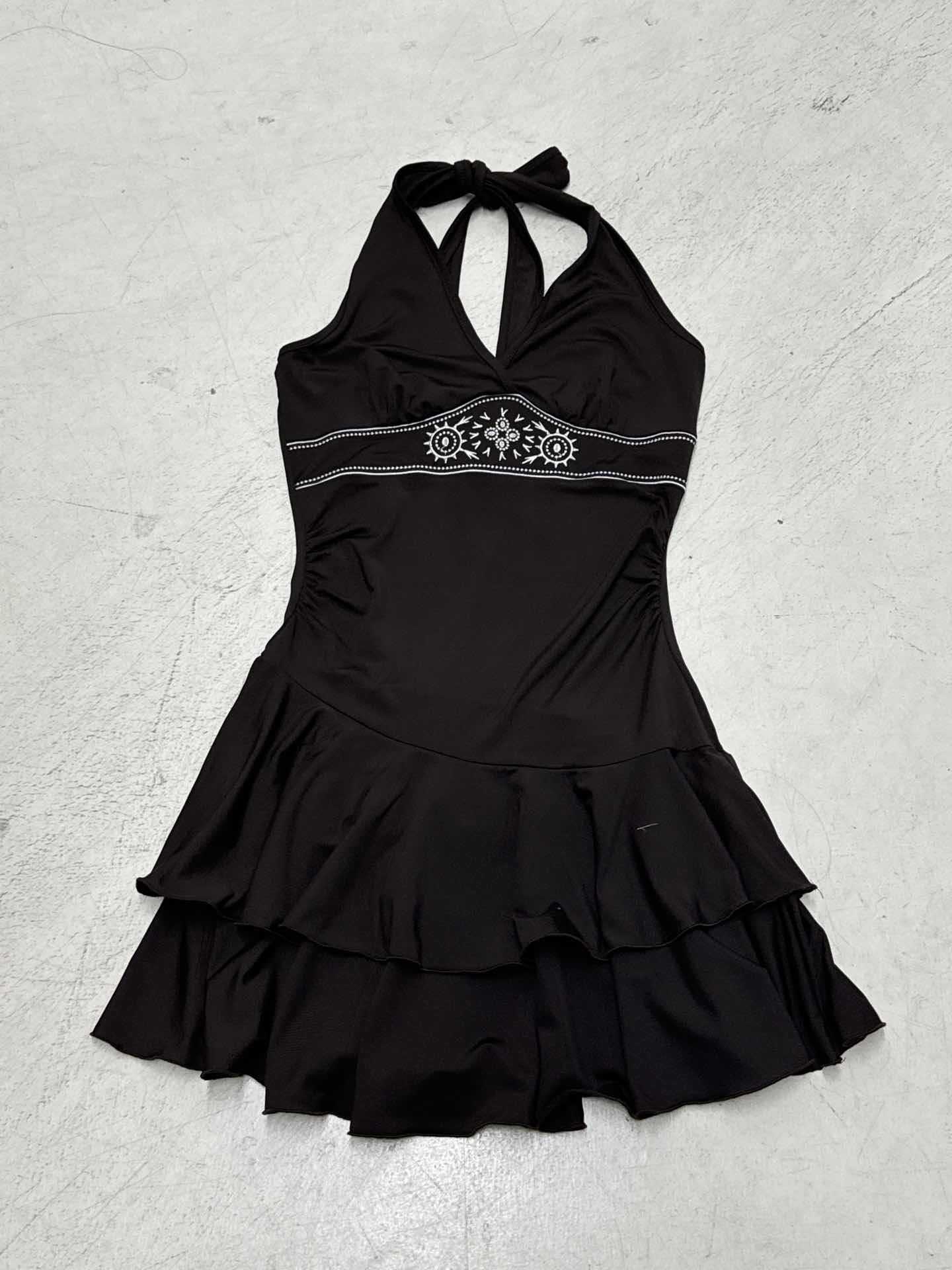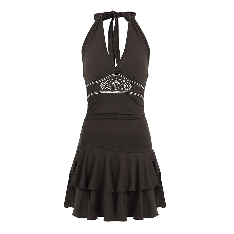 Light-Cooked Style Retro Embroidery Patterned Waist Dress Sexy Deep V-Neck Hanging Neck High-Waisted Lotus Leaf Side Skirt HZ1220