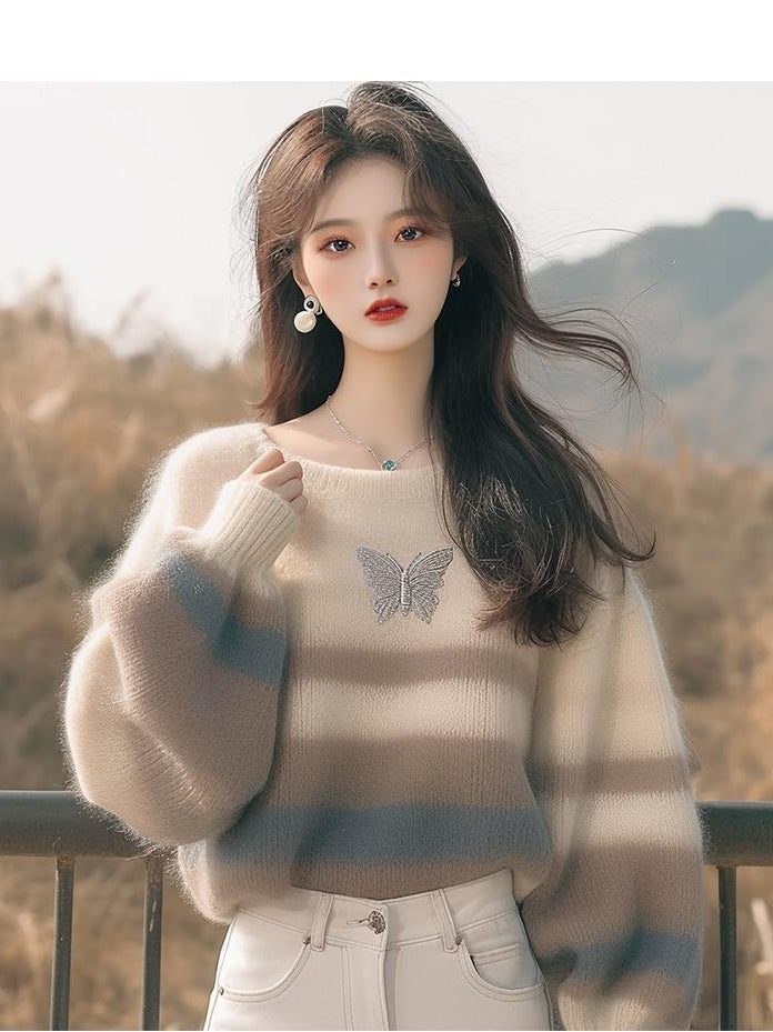 Autumn Fashion Style Sweater Korean Soft-Creative Languid Lazy Super-Good-Looking White Striped Print Sweater HZ1208