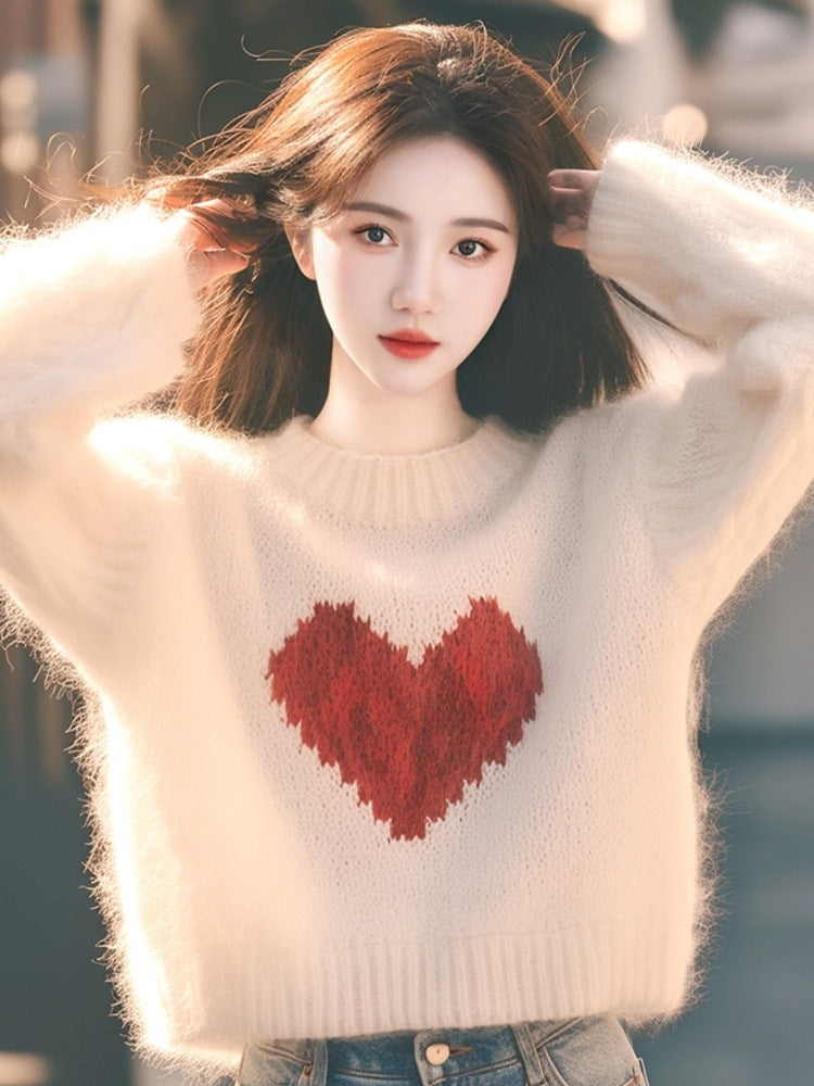 White Love Print Lazy Sweater Knitted Women 2025 Autumn And Winter New Korean Atmosphere Feeling Top HZ1208