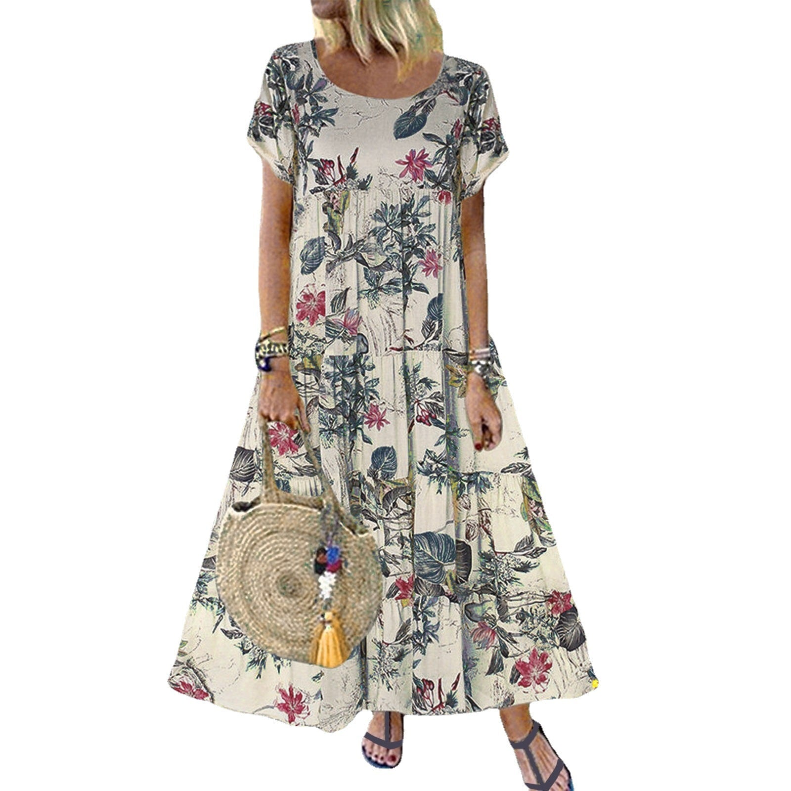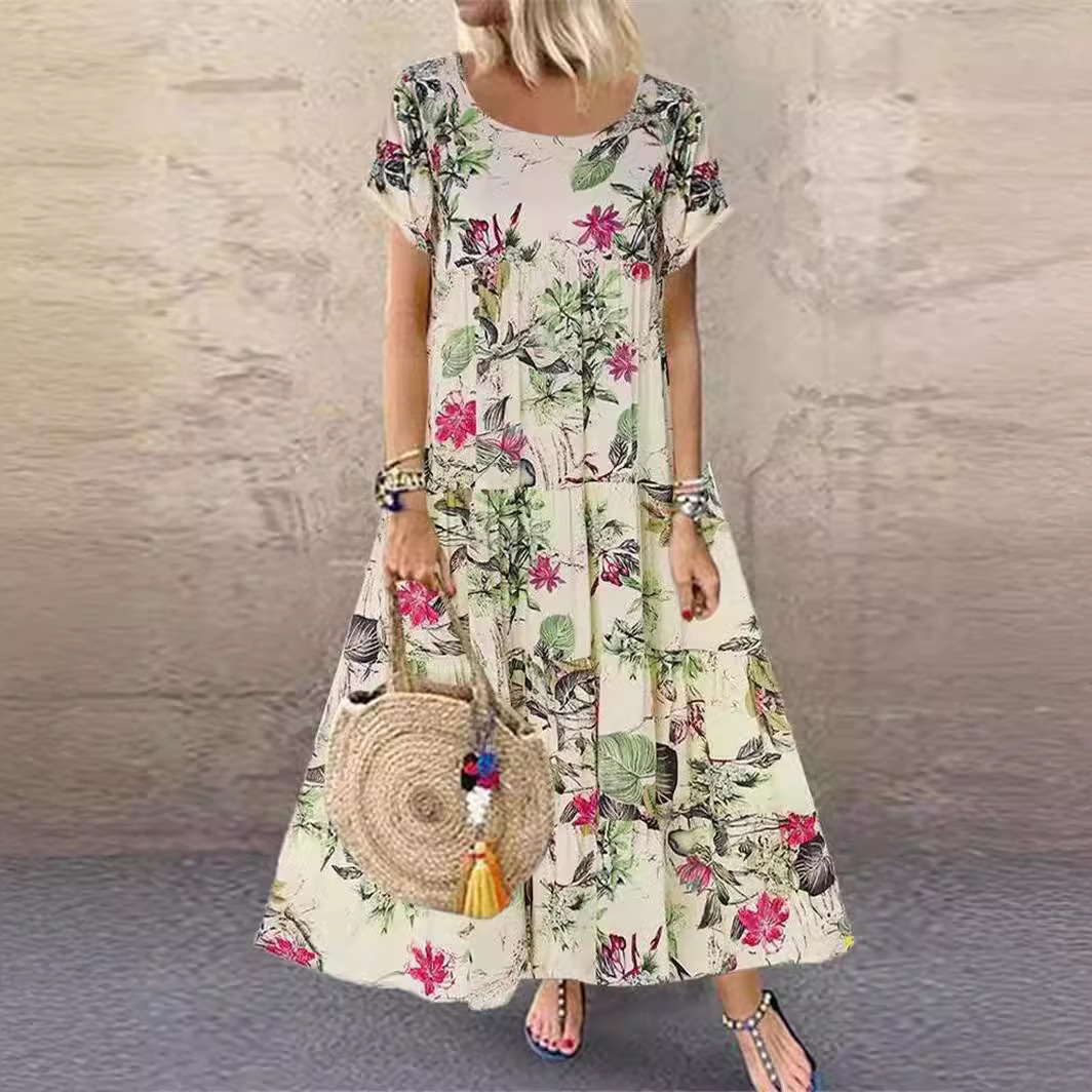 2025 Explosion Women's Vintage Flower Printed Short Sleeve Round Dress HZ1220