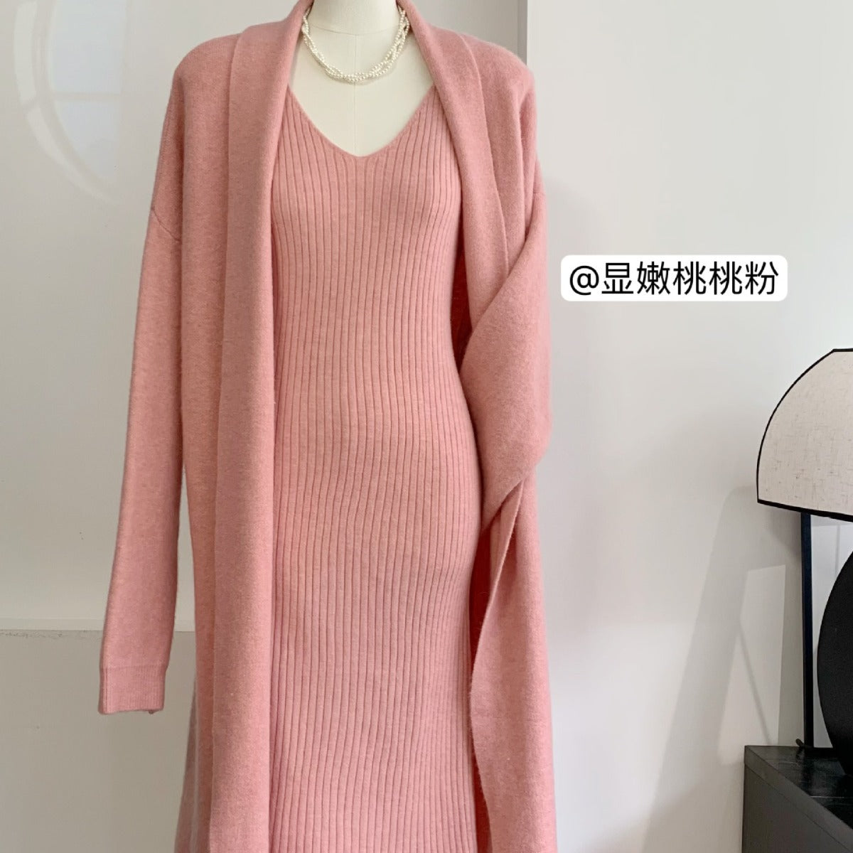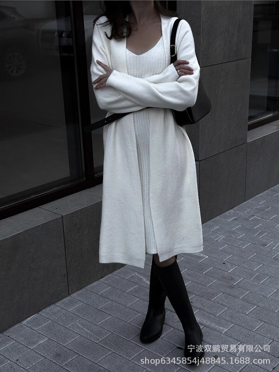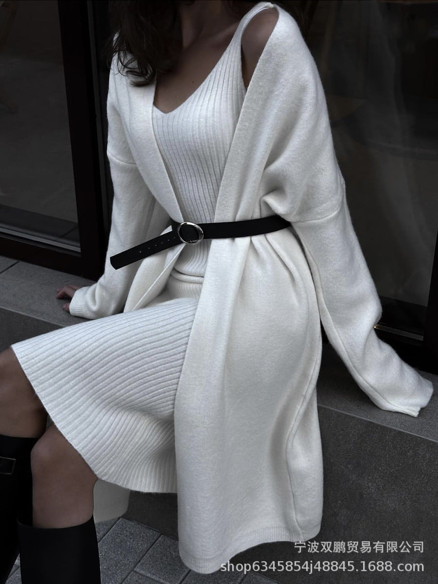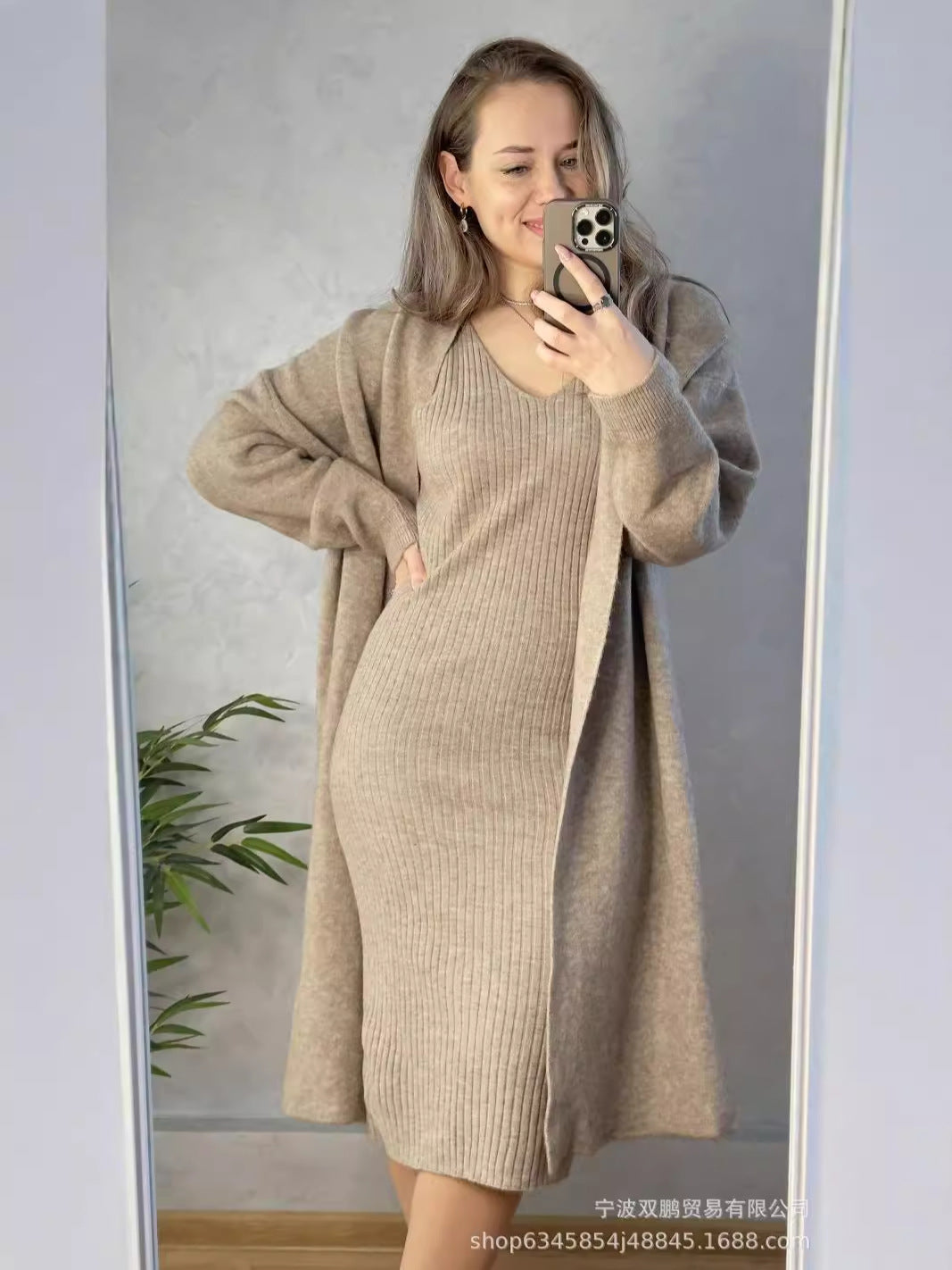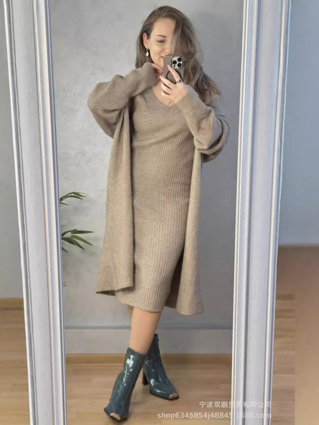 2025 New Solid V-Neck Jacket Dress + Sweater Cardigan Hot Elegant Knitted Set HZ1208