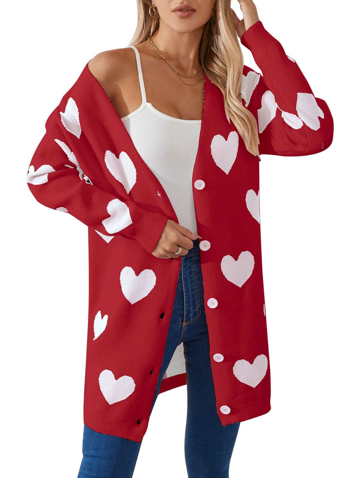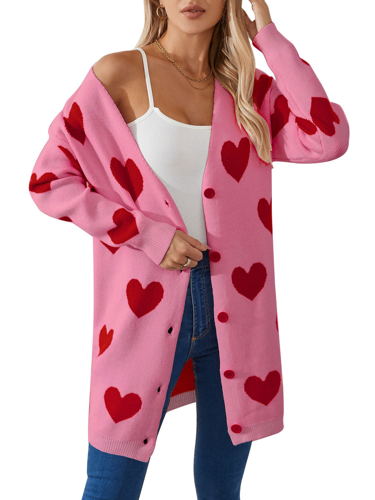 2025 New Valentine's Day Love Knitted Cardigan V-Neck Button Long Coat Sweater Woman HZ1208