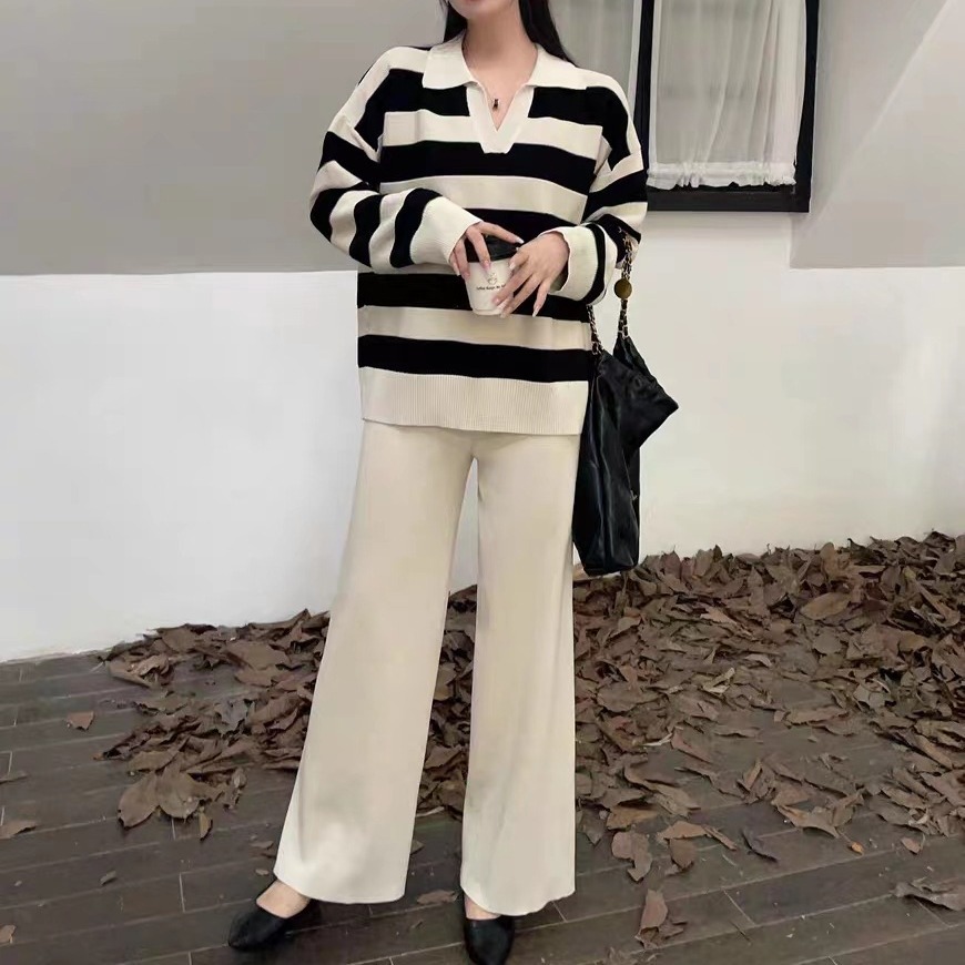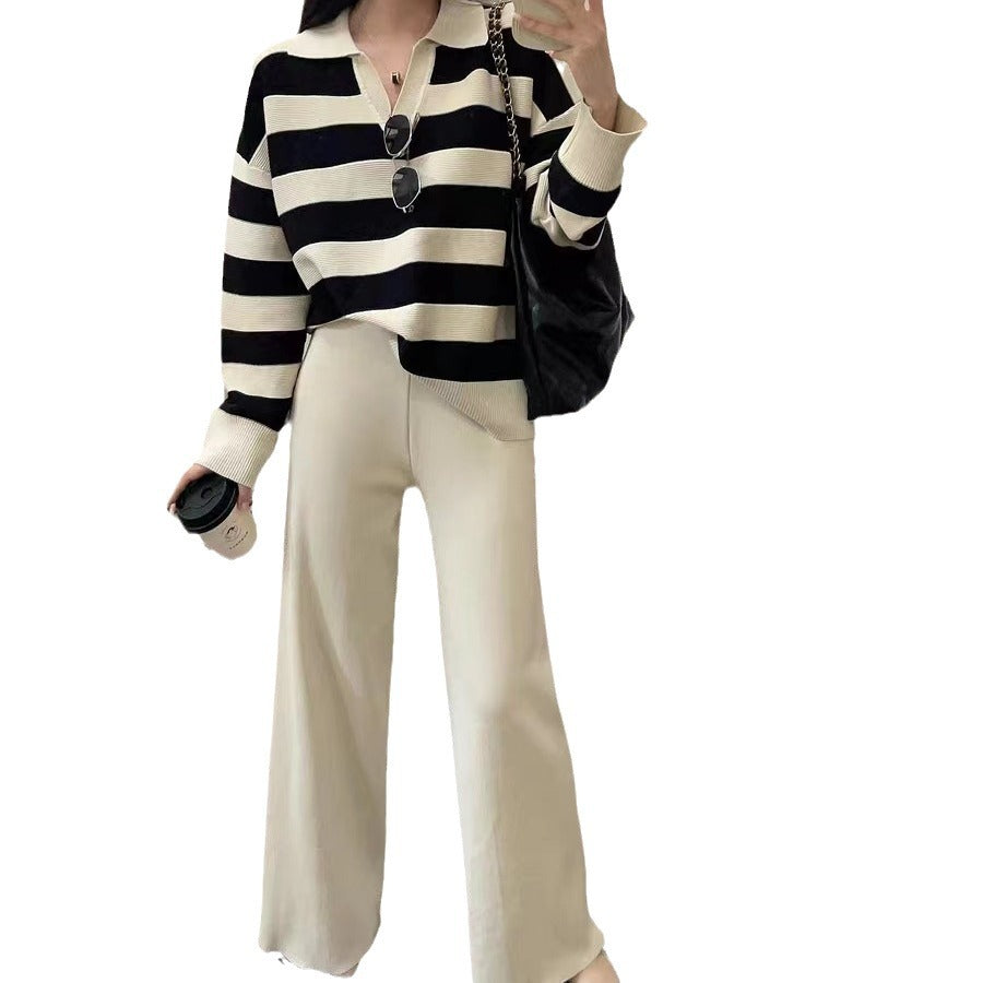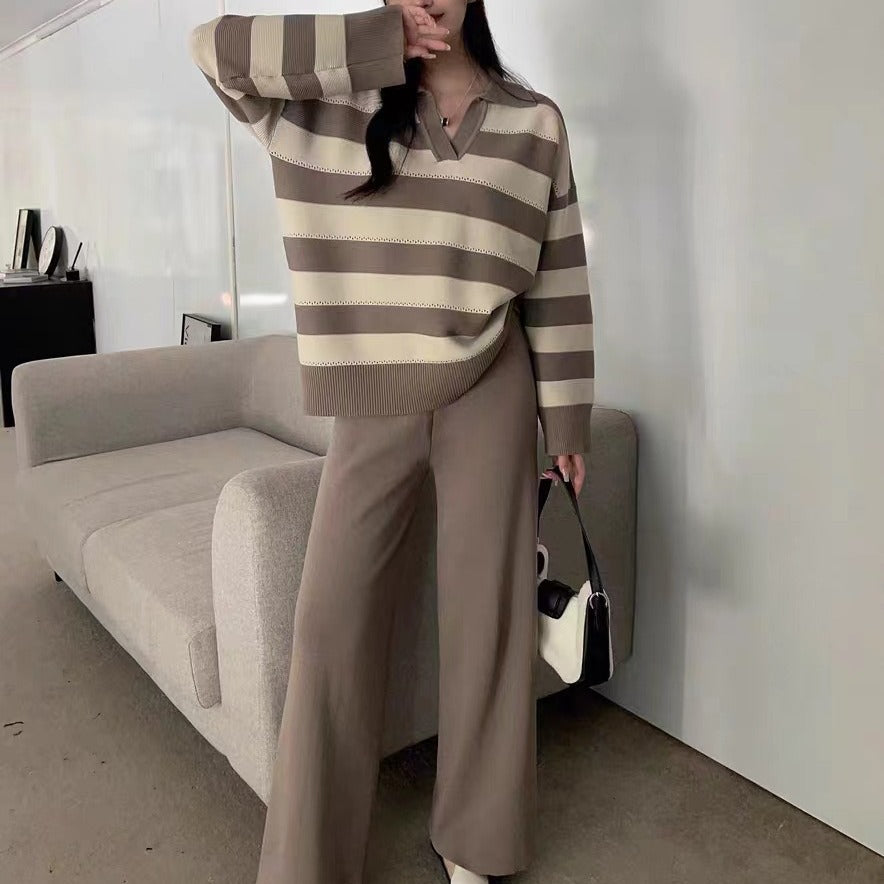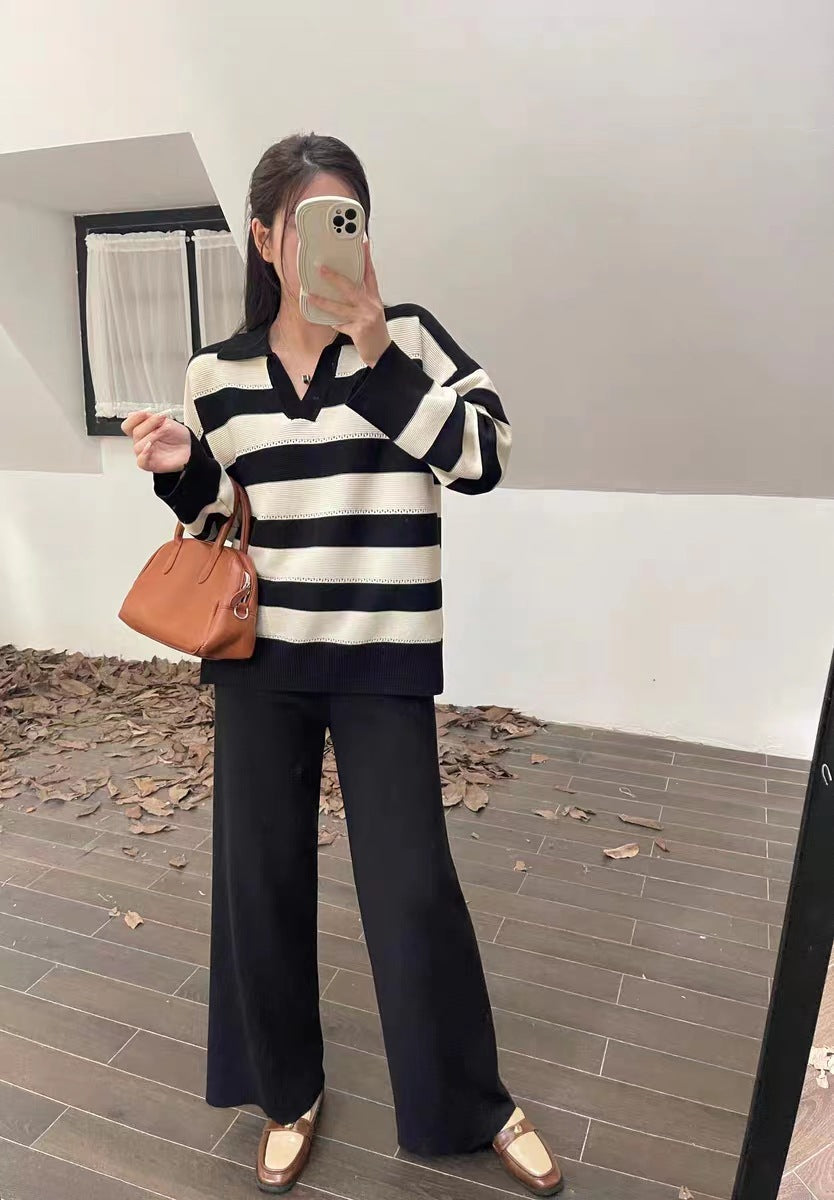 2025 Vintage Lazy Wind High-End Softy Loose Stripe Collar Fashion Knitting Suit Woman HZ1220