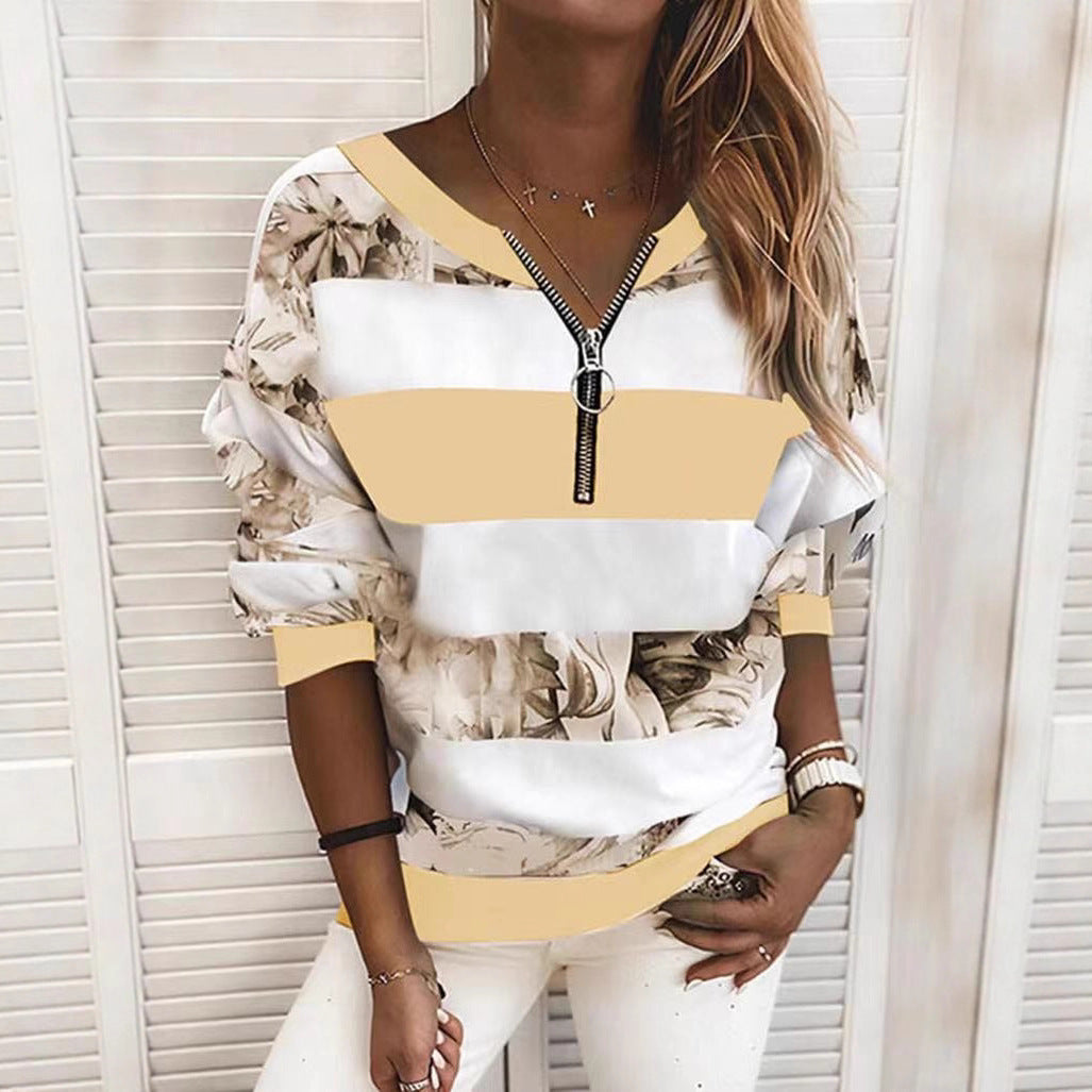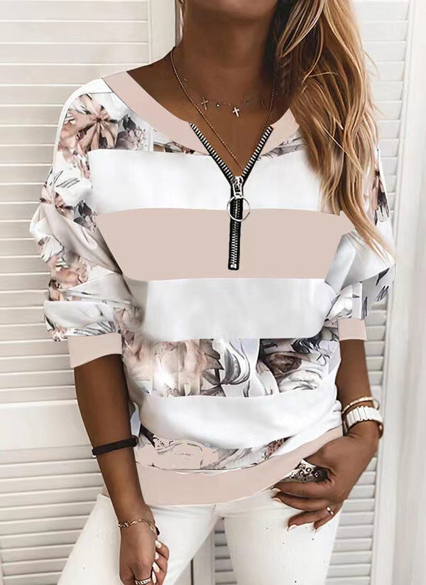 2025 Women's New Digital Printing Zipper V-Neck Loose Leisure Clothing Long-Sleeved Top HZ1220