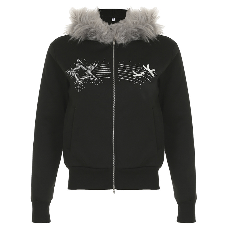 Autumn And Winter New Hair Splicing Hoodie Women's Dark And Dark Style Personality Street Star Hot Diamond Zipper Coat Top HZ1220