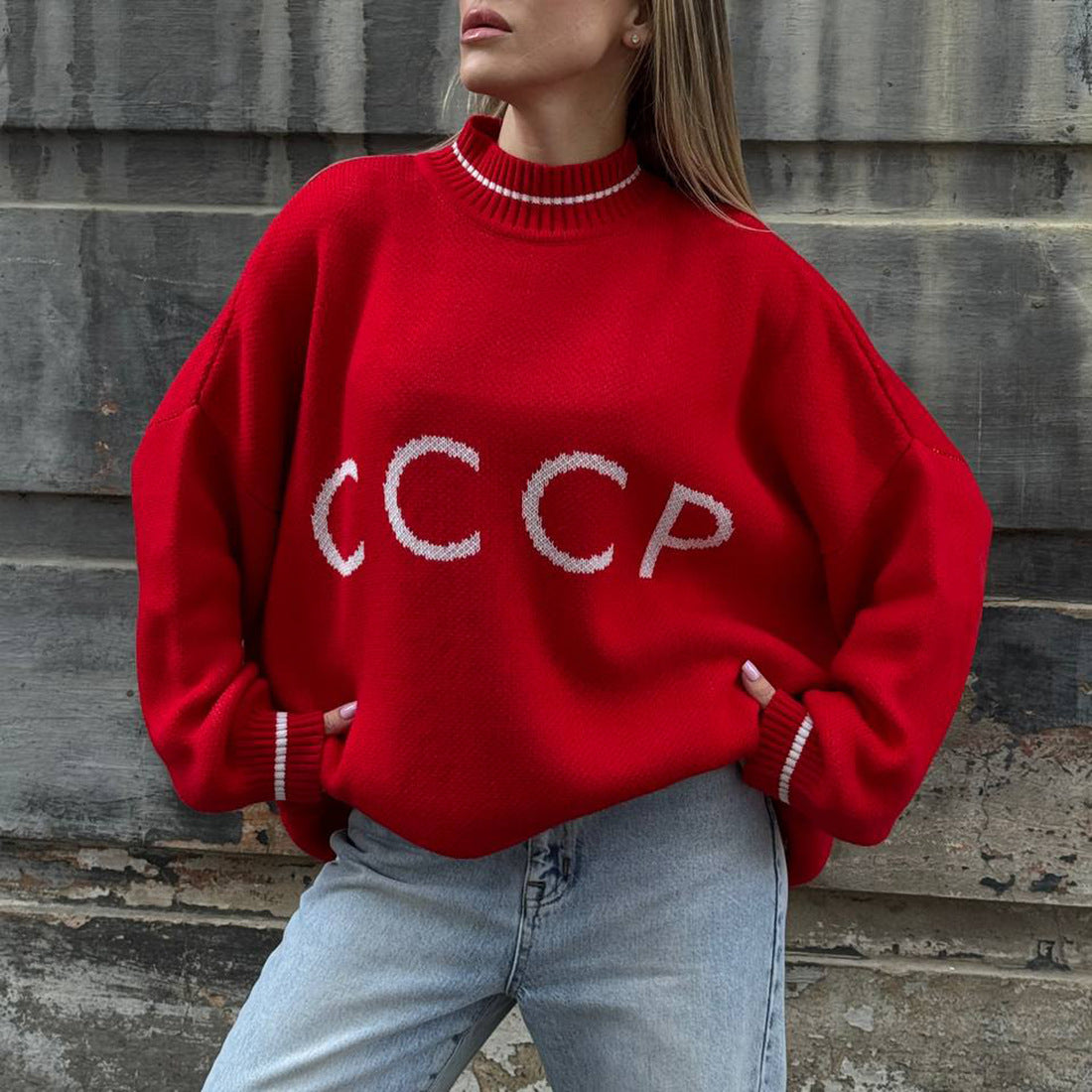 CCCP Red Small Round Collar Sweater Women Loose Retro Knitted Shirt Autumn And Winter Hooded Blouse HZ1208