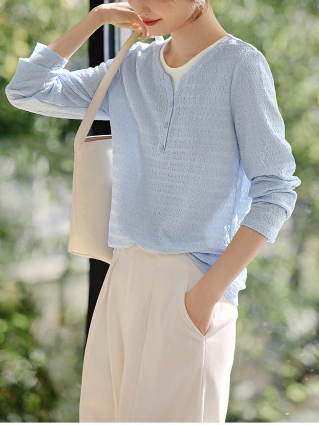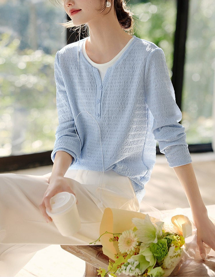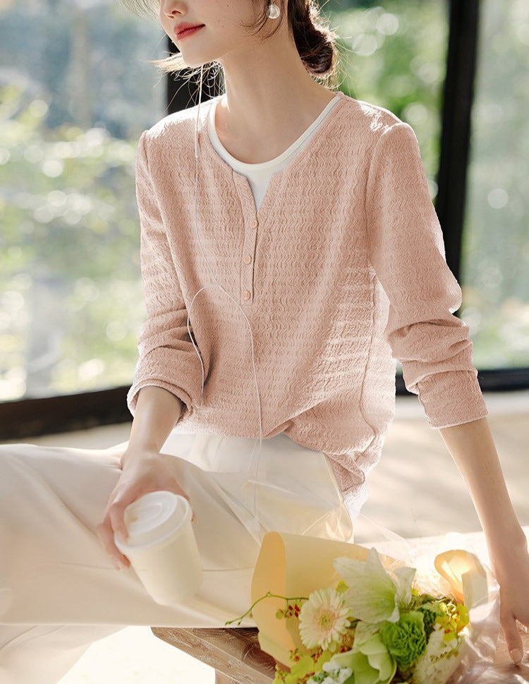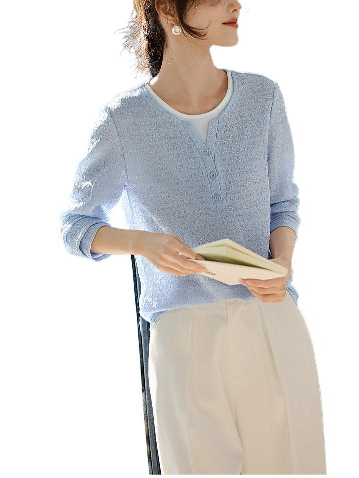 Design Fake Two Splicing Texture T-Shirt Girl 2025 Spring Intellectual Elegant Texture Sense Thin Age Blouse HZ1208