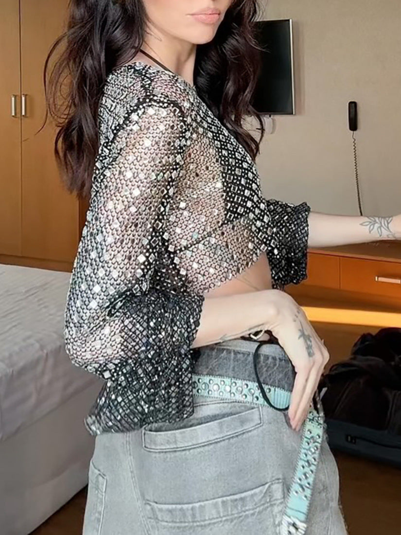 French Hottie Blouse Female Feeling Hollow Short Umbilked Pure Style T-Shirt Horn Sleeve HZ1208
