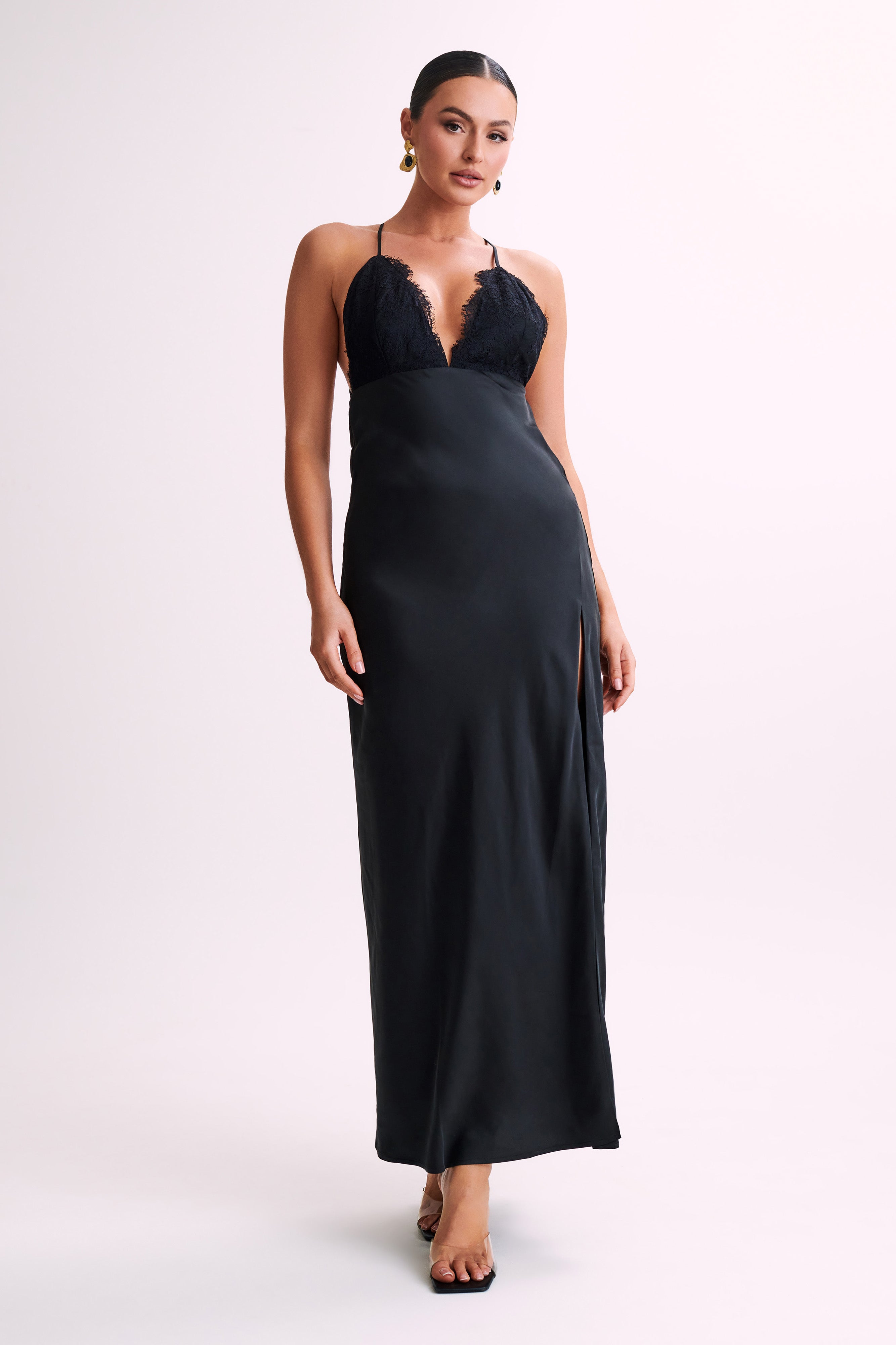 The GINA is a sleeveless maxi dress with a plunging neckline and loose, flowing hem. The design is elegant and sophisticated, with delicate lace bust panels and a soft cowl neck that streams into slender spaghetti straps. These traps cross at the back, beautifully framing the low, open back. The loose, relaxed fit cascades around the legs and is accentuated with a thigh-high skirt split, making for an artful silhouette.