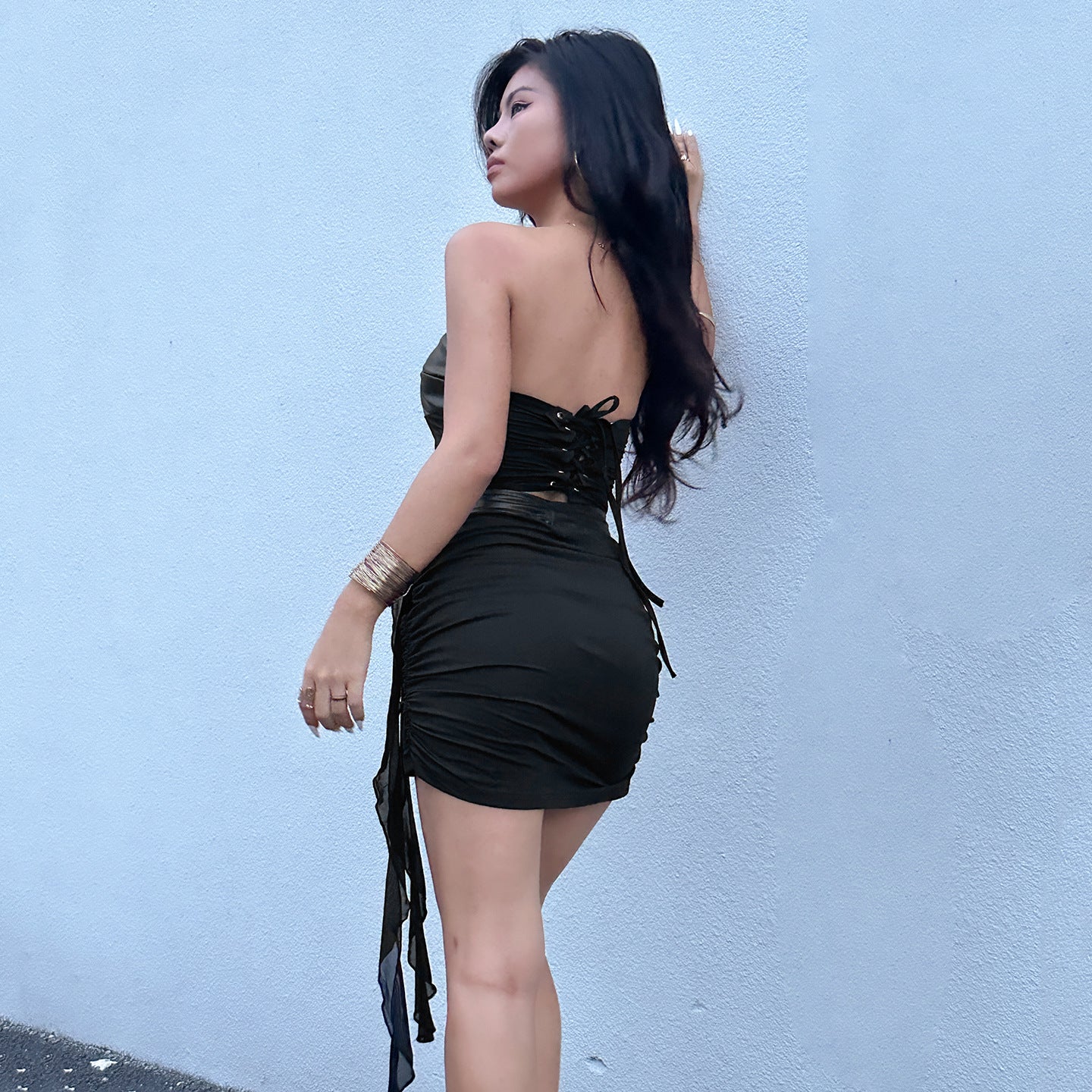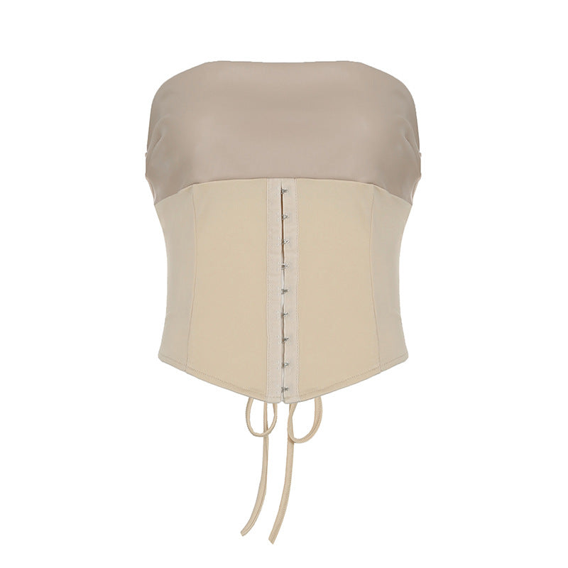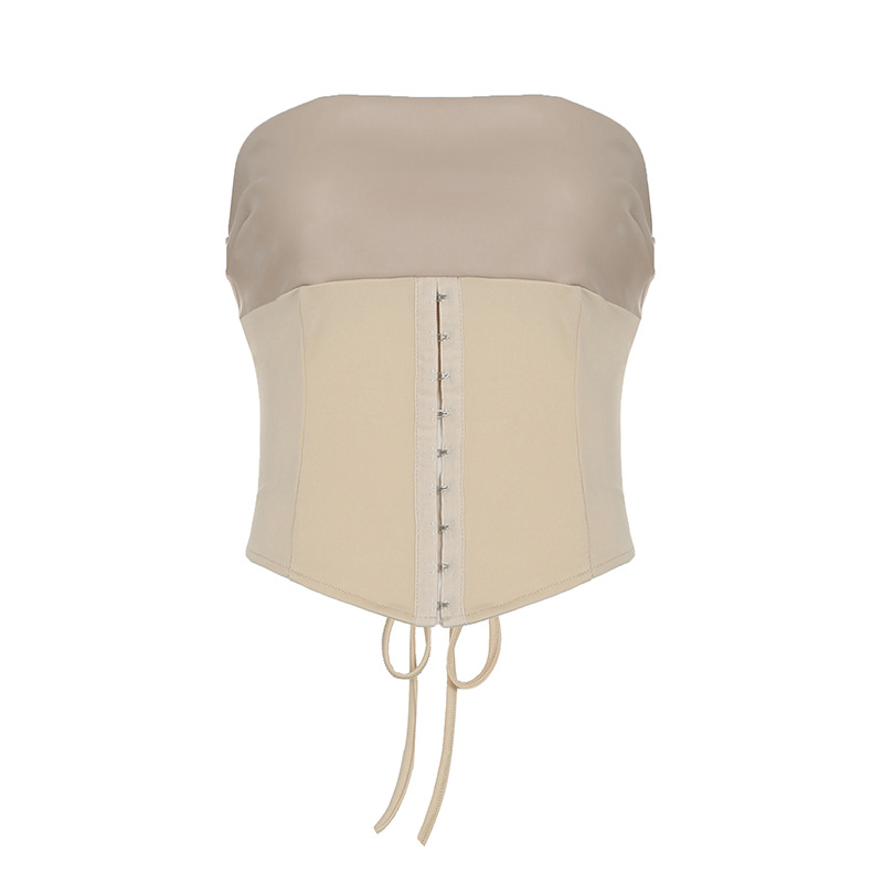 Sexy Leather Suit PU Leather Splicing Waist Tsets Hollow Folding Net Lace-Uped Ass Skirt HZ1220