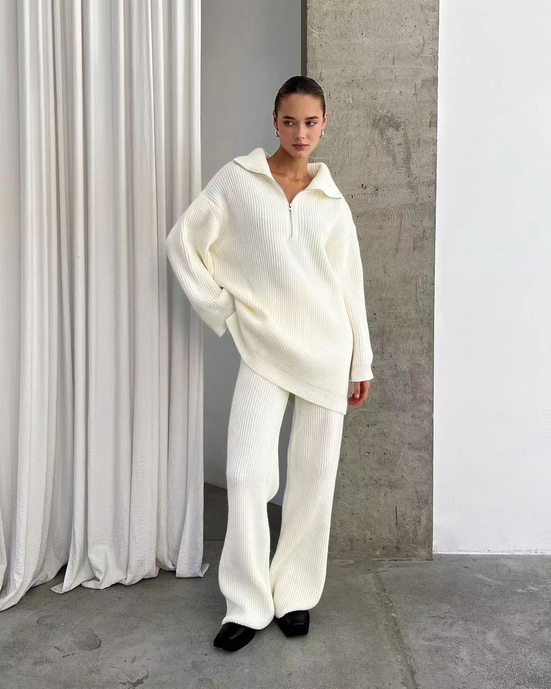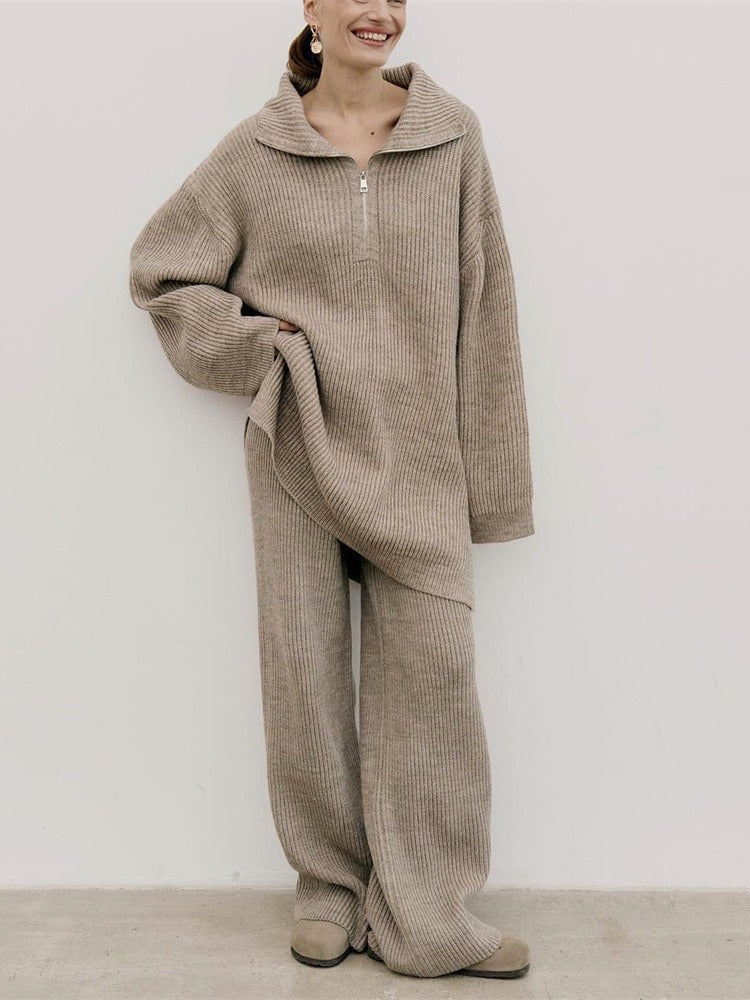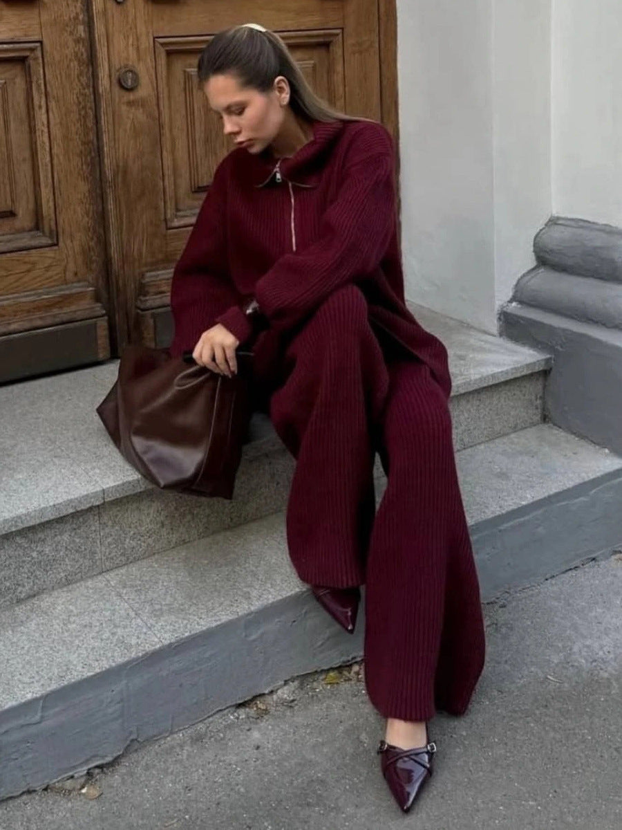 Single Simple High-End Solid Color Set Women's Autumn And Winter Half Zipper Sweater Knit Straight Trousers Two Sets HZ1208