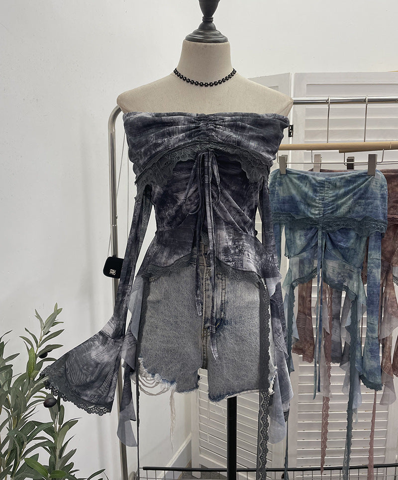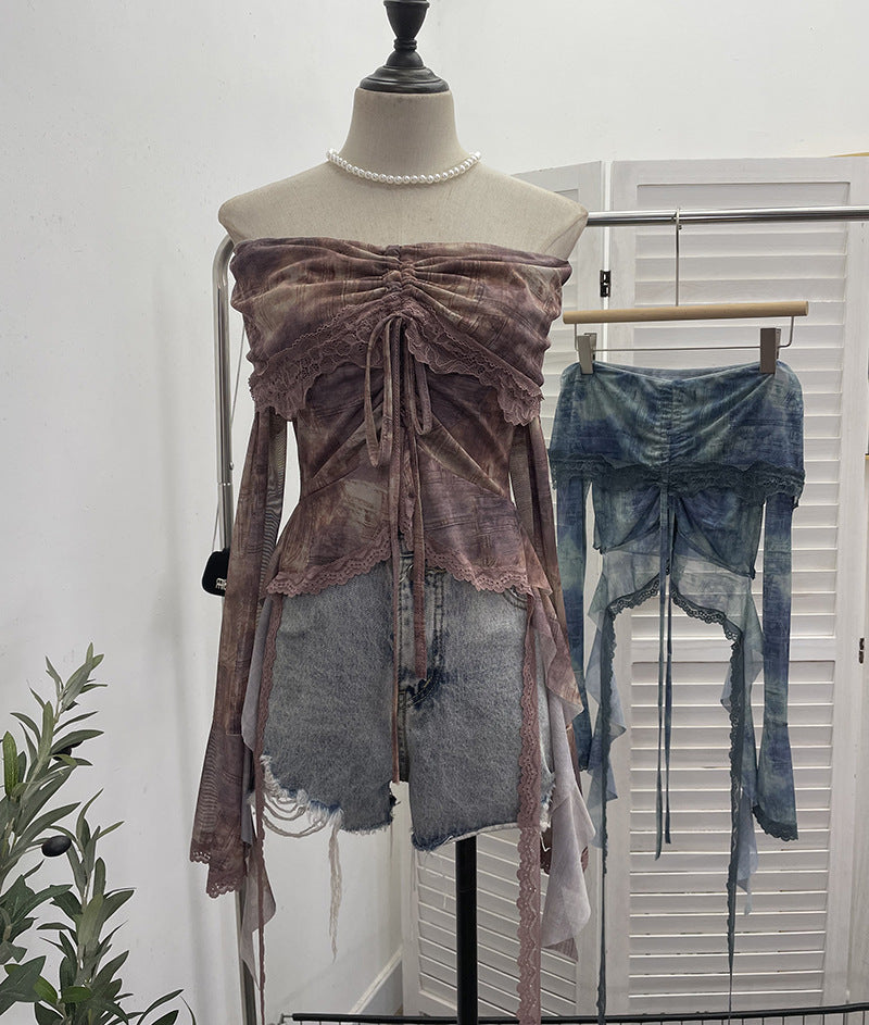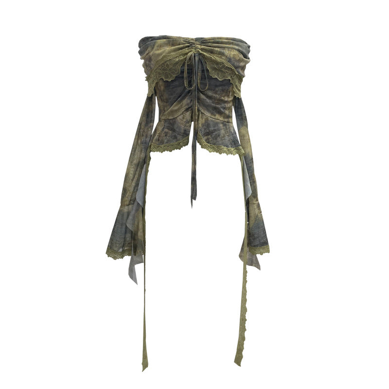 Small-Sized Old-Fashioned Green Shoulder Horn Sleeve Blouse Dye Net Yarn Lace Draw Rope Short T-Shirt 8010 HZ1208