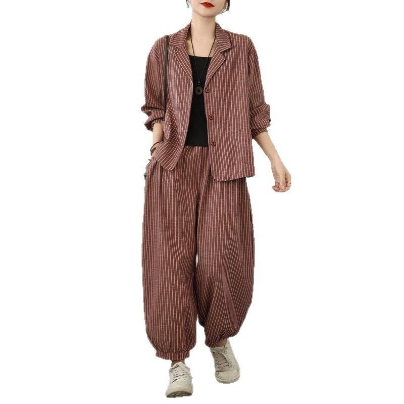 Spring 2025 Vintage Literary Striped Large-Size Cardigan Coat + Wide-Legged Harlan Pants Two Sets Of Women HZ1220