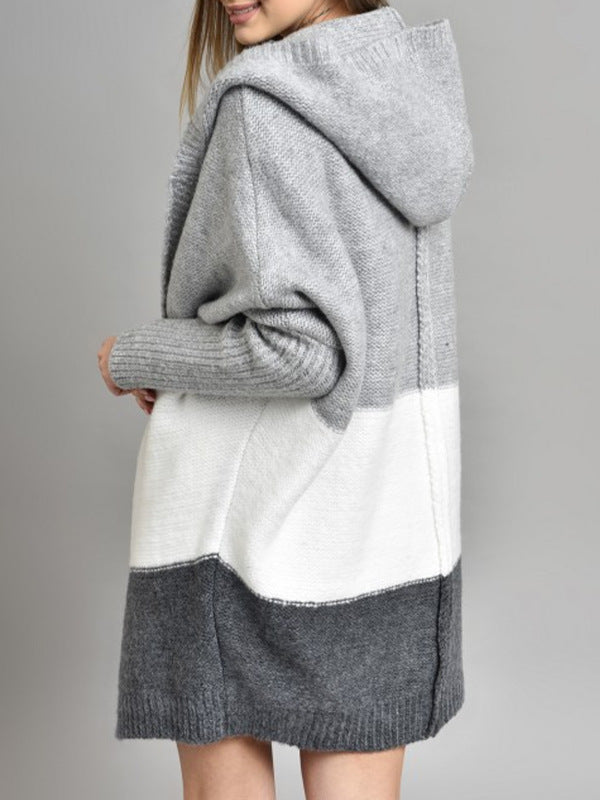 Spring And Autumn Classic Splicing Color Knitted Sweater Cardigan Women's Fashion Hooded Loose Casual Coat HZ1208