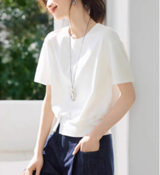 White Short-Sleeved T-Shirt Women's Summer 2025 New Casual Design Feeling Under The Fork Decorative Buckle Clasp Blouse HZ1208